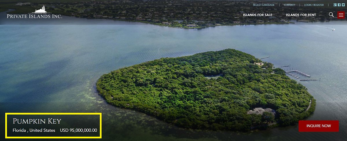 미국 플로리다에 위치한 펌킨키섬은 9500만 달러(1163억 원)에 이르기까지.